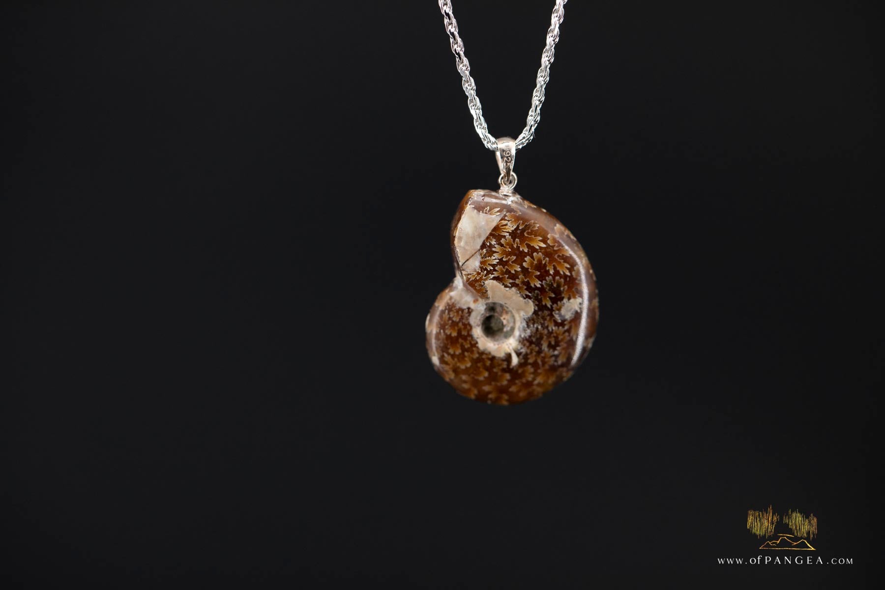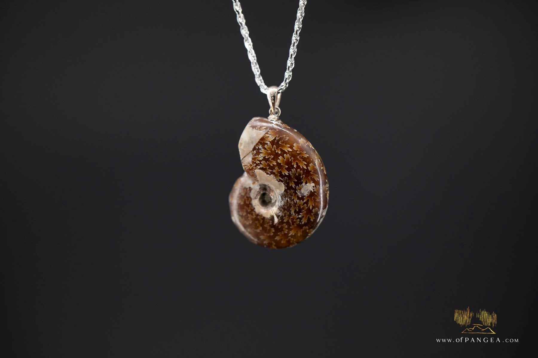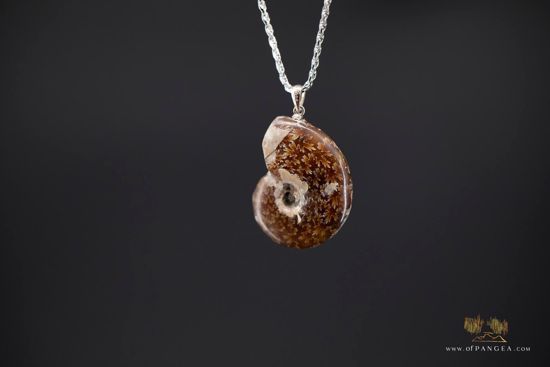 JF691 || Flower Agate Per-mineralized Full Ammonite Fossil Necklace (Med-sized).