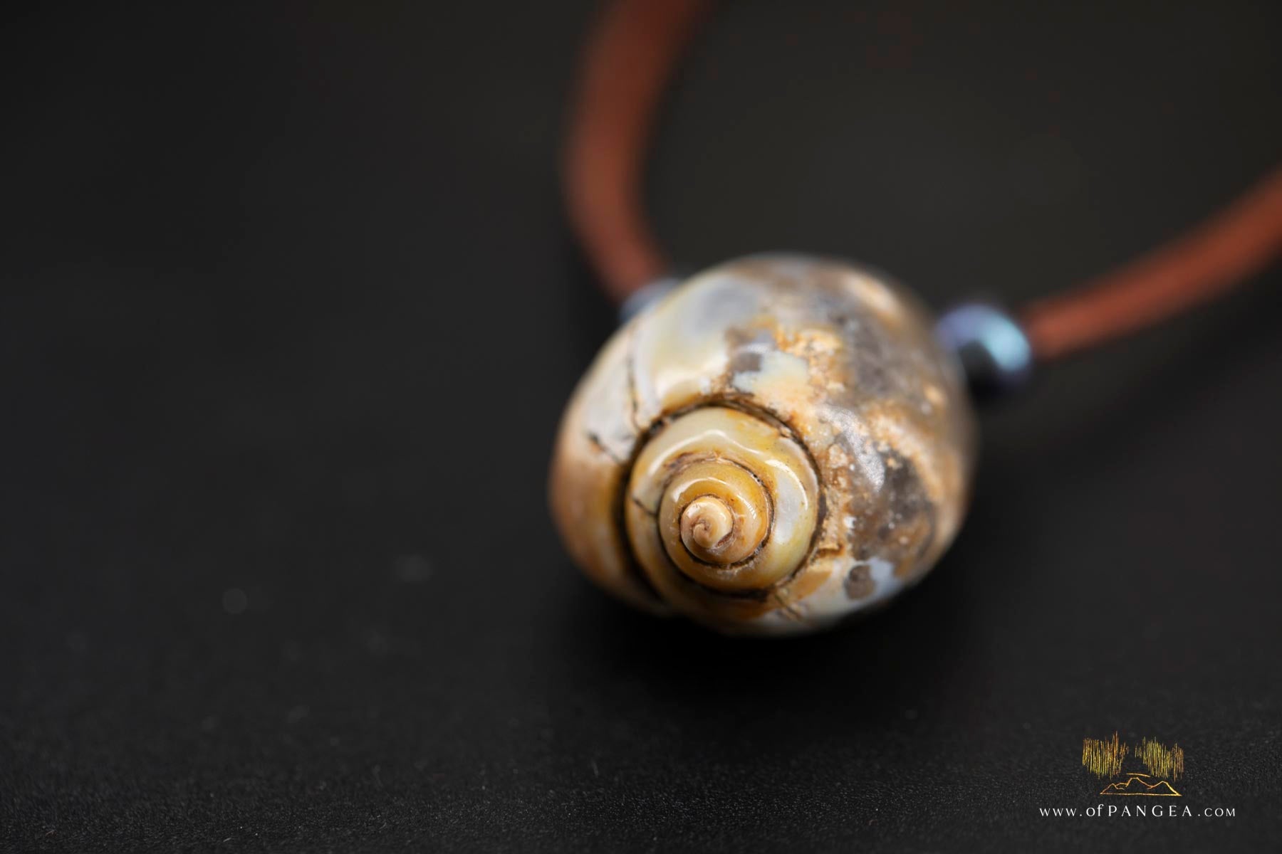 Agatized Spiral Shell fossil and AAA Peacock Pearl - italian leather necklace || JF687