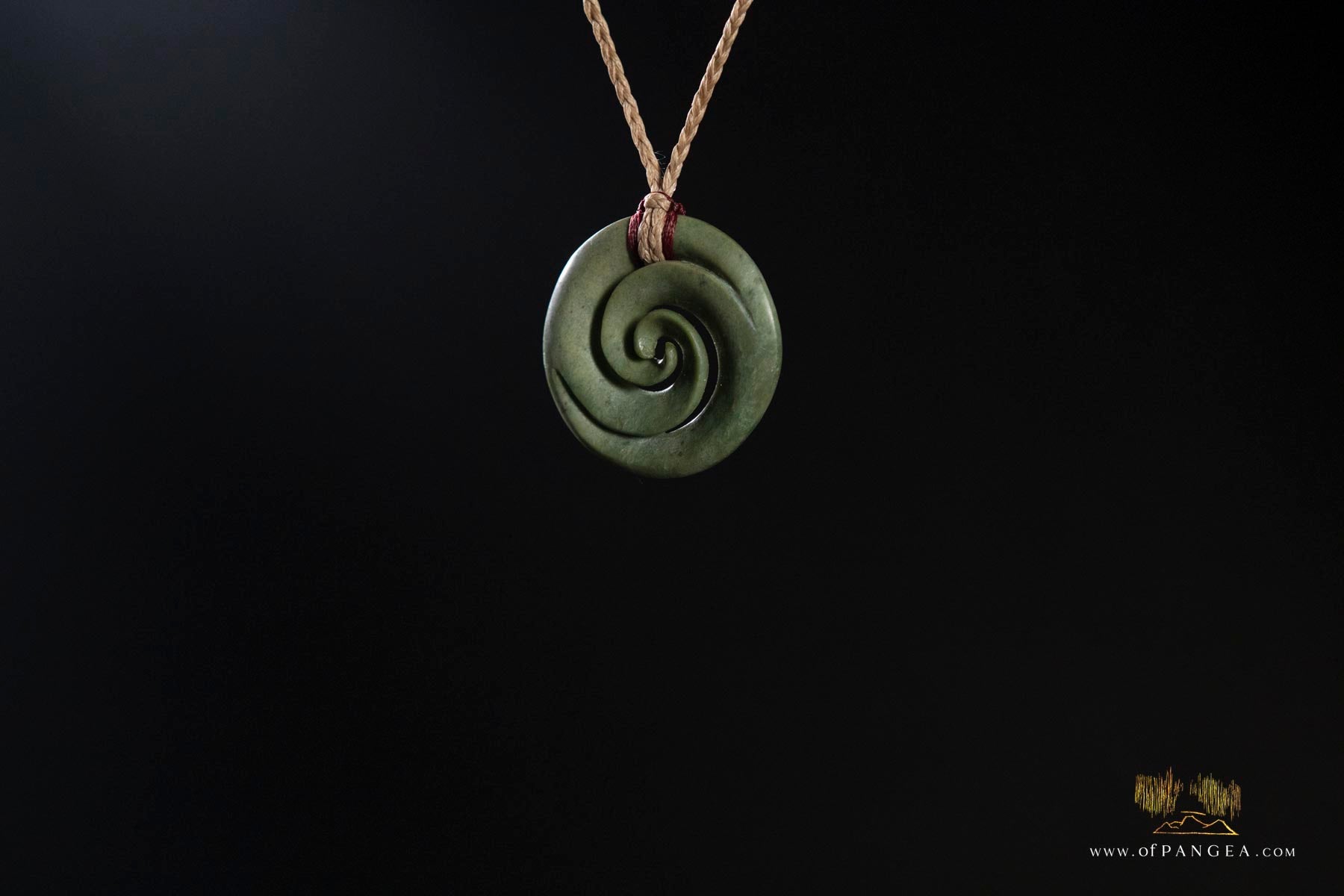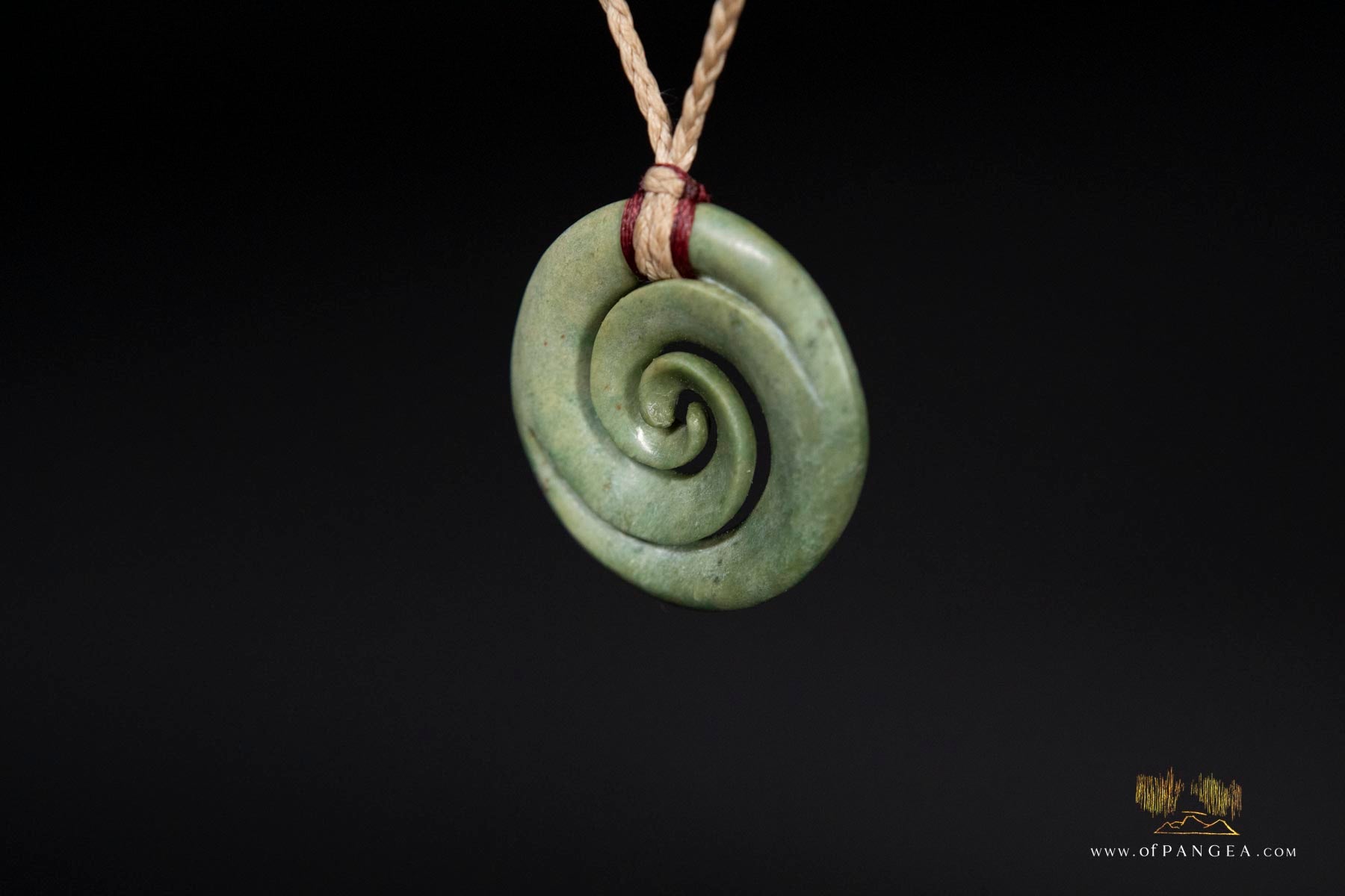 This taonga (treasure) hand-carved from nephrite jade features the double koru, one of the most significant and popular Māori symbols. It is created by intertwining two koru, the spiral shape of the unfurling fern frond.