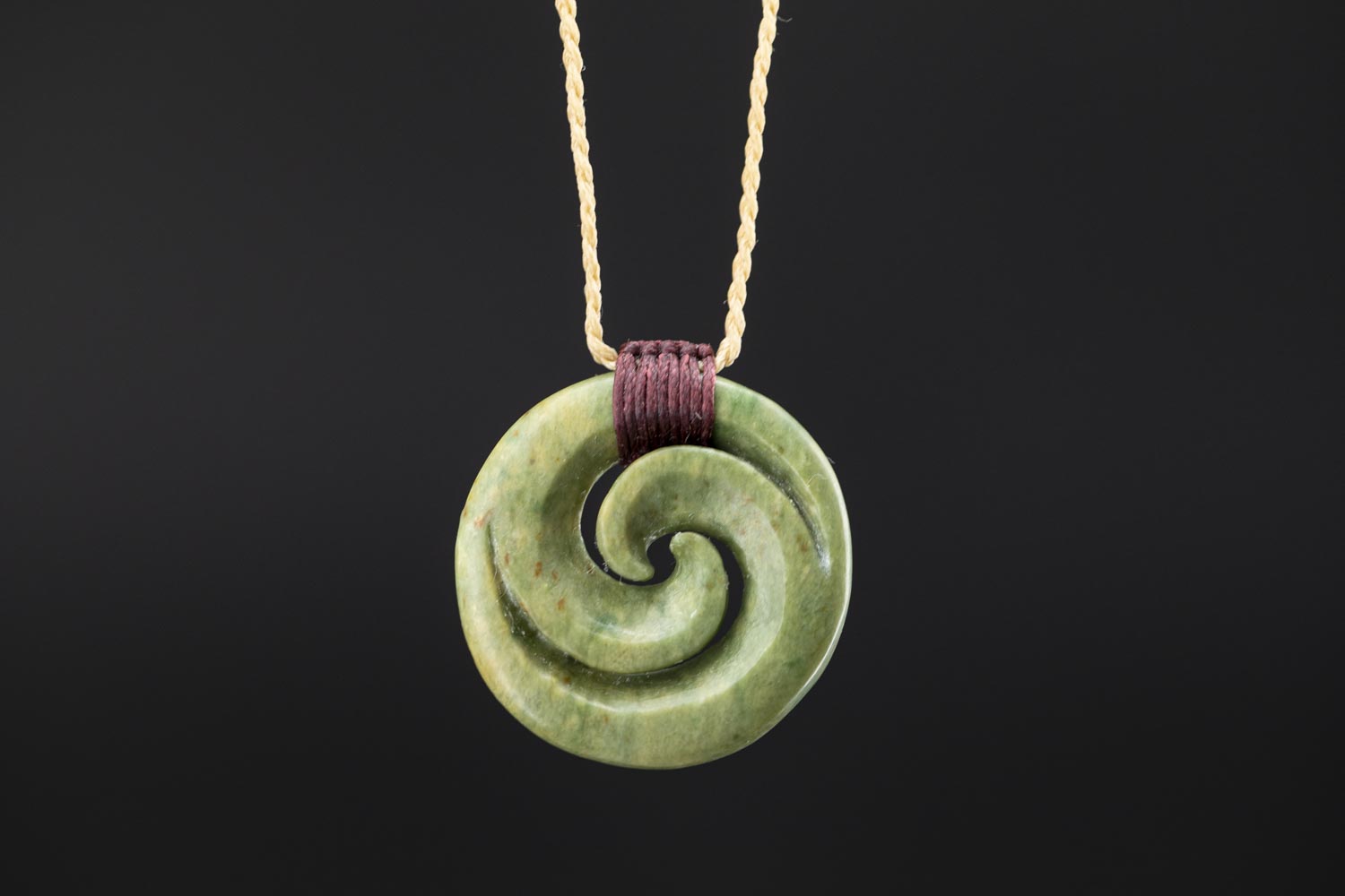 This taonga (treasure) hand-carved from nephrite jade features the double koru, one of the most significant and popular Māori symbols. It is created by intertwining two koru, the spiral shape of the unfurling fern frond.