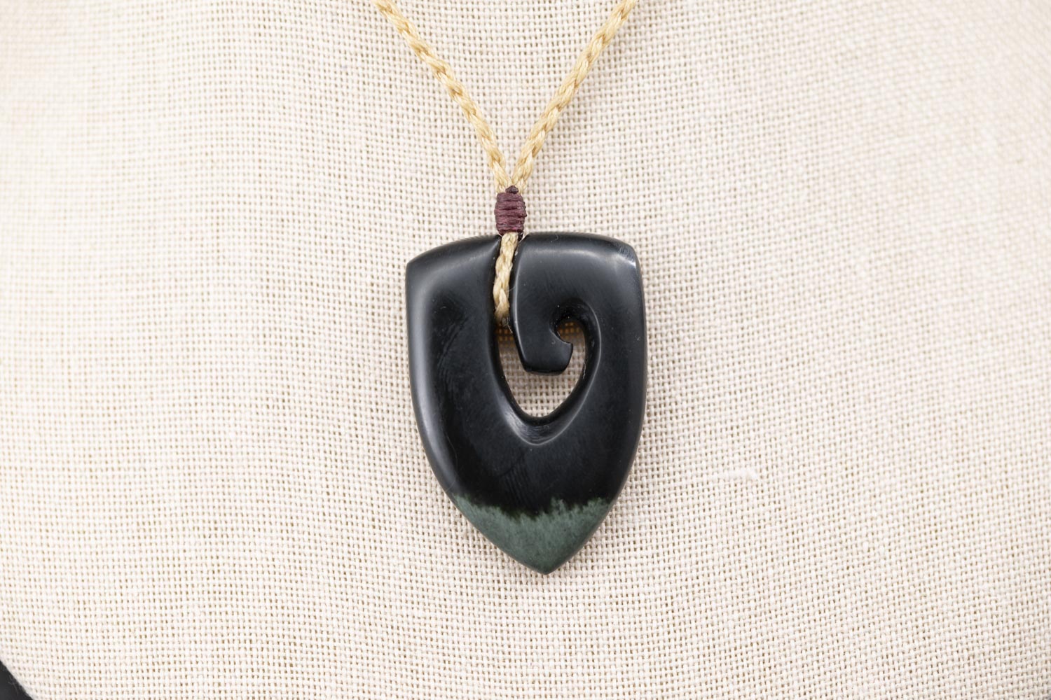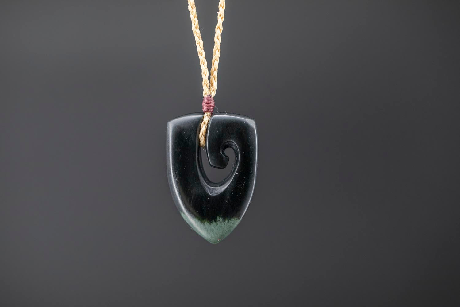 JF1075 || Hei Matau Kouma - Hook Shield pendant carved from Wyoming Black Nephrite Jade - muka tan three plaited waxed cord Necklace – by Joe Foster