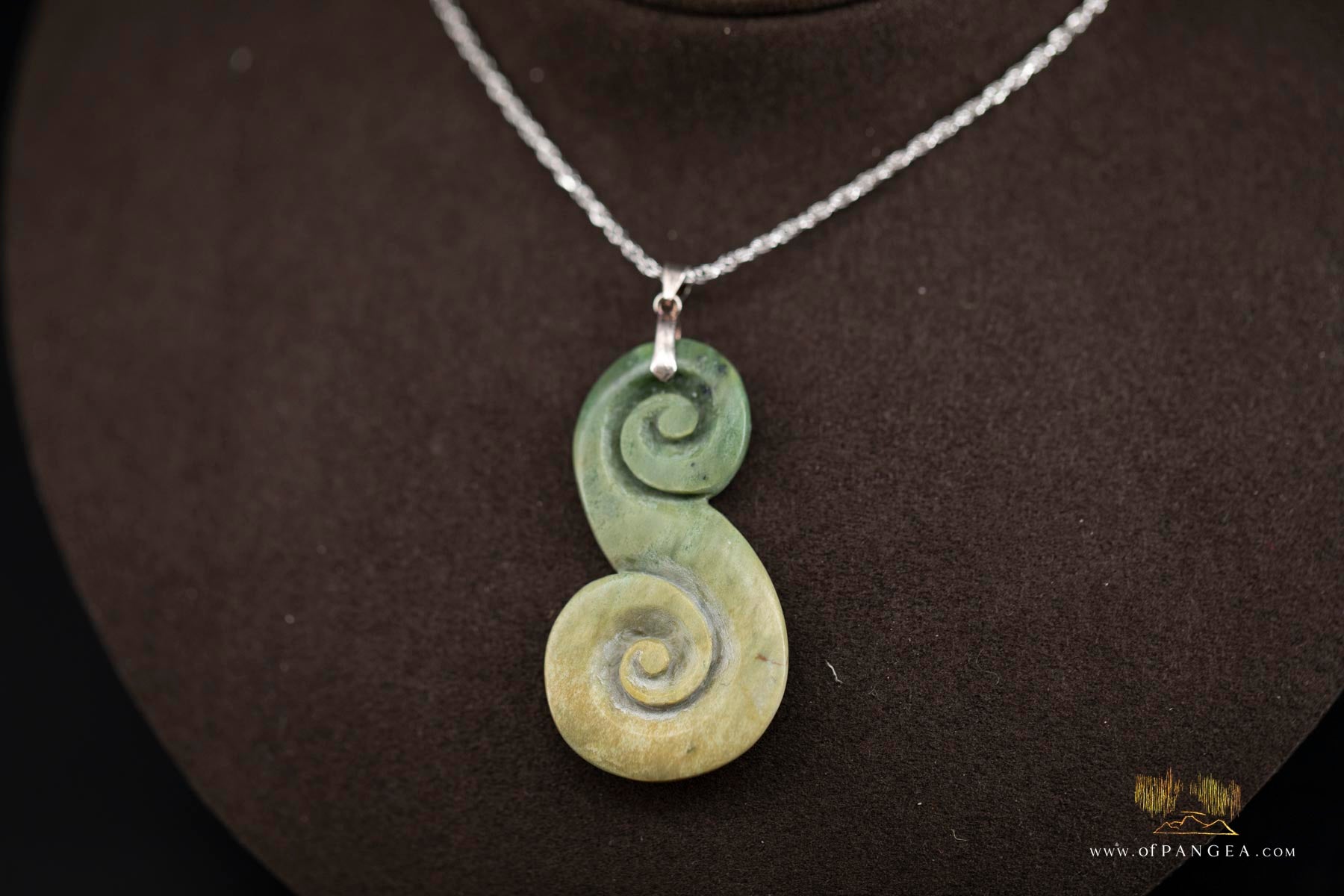 Double Koru carved from Raukaraka Pounamu Nephrite Flower Jade - Italian Sterling Silver Necklace. A pendant hand-carved from my personal collection of Pounamu Nephrite Jade from New Zealand – by Joe Foster