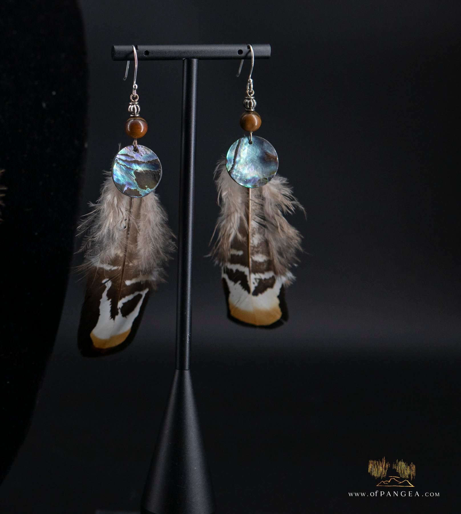 Kwakiutl THUNDERBIRD Earrings - pheasant feather, abalone, tiger's eye - sterling silver || JF310