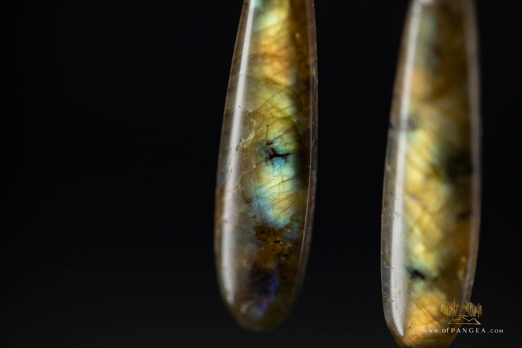 JF657 || Incredible Rainbow Flash top to bottom and front to back on these Labradorite teardrop earrings - Sterling Silver - each teardrop has 'flash' of rainbow depending on the angle to the viewer and a variety of pictures are shown to depict the amount. High polish finish.
