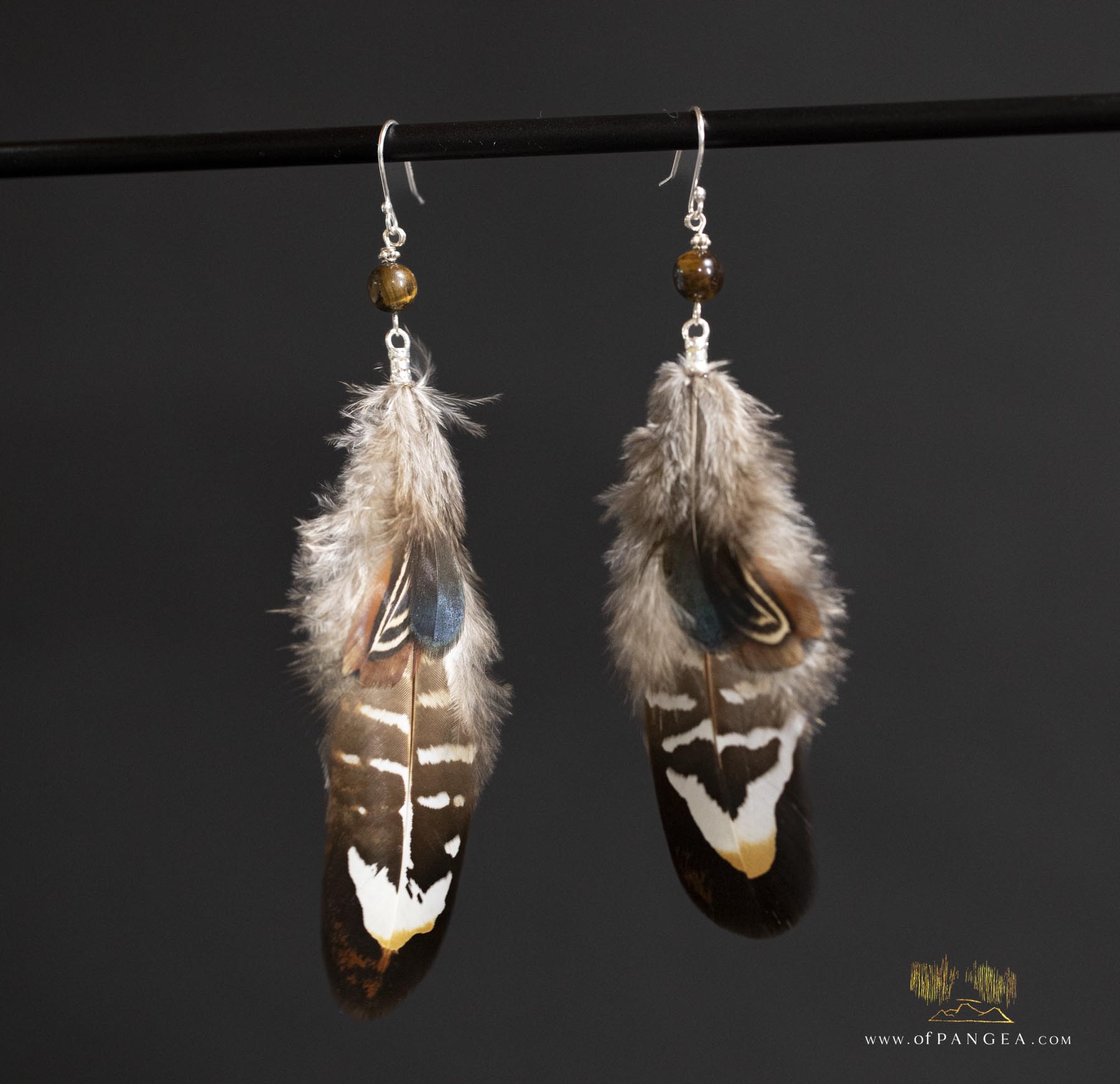JF317 || Pheasant Feather Earrings - Tiger's Eye Bead - Sterling Silver