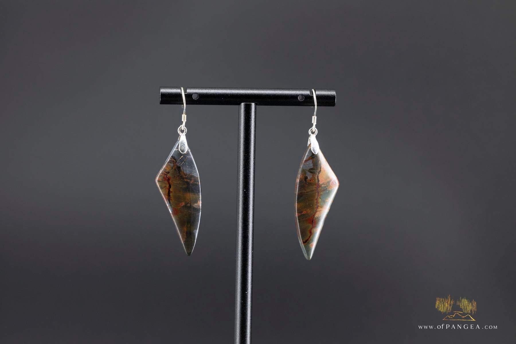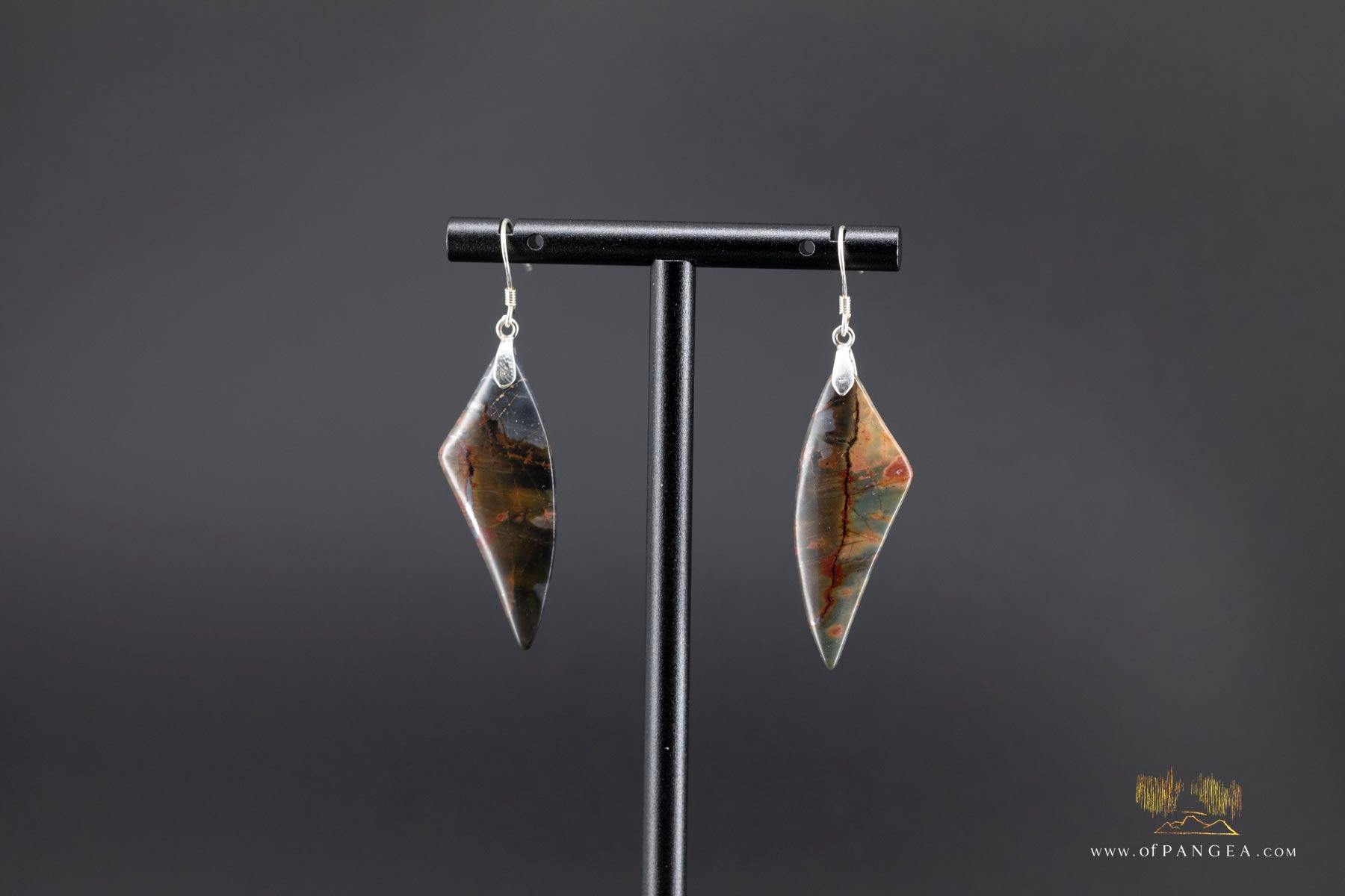 JF757- Picasso Jasper (Red Creek) 'wing' earrings - each it's own one of a kind mosaic front and back. High polish finish and this pair has some body to it with a flatter back and very rounded front - 0.925 Sterling Silver