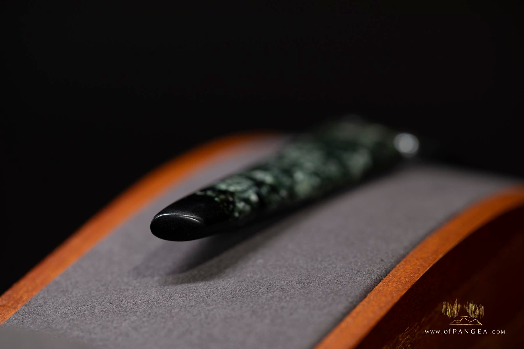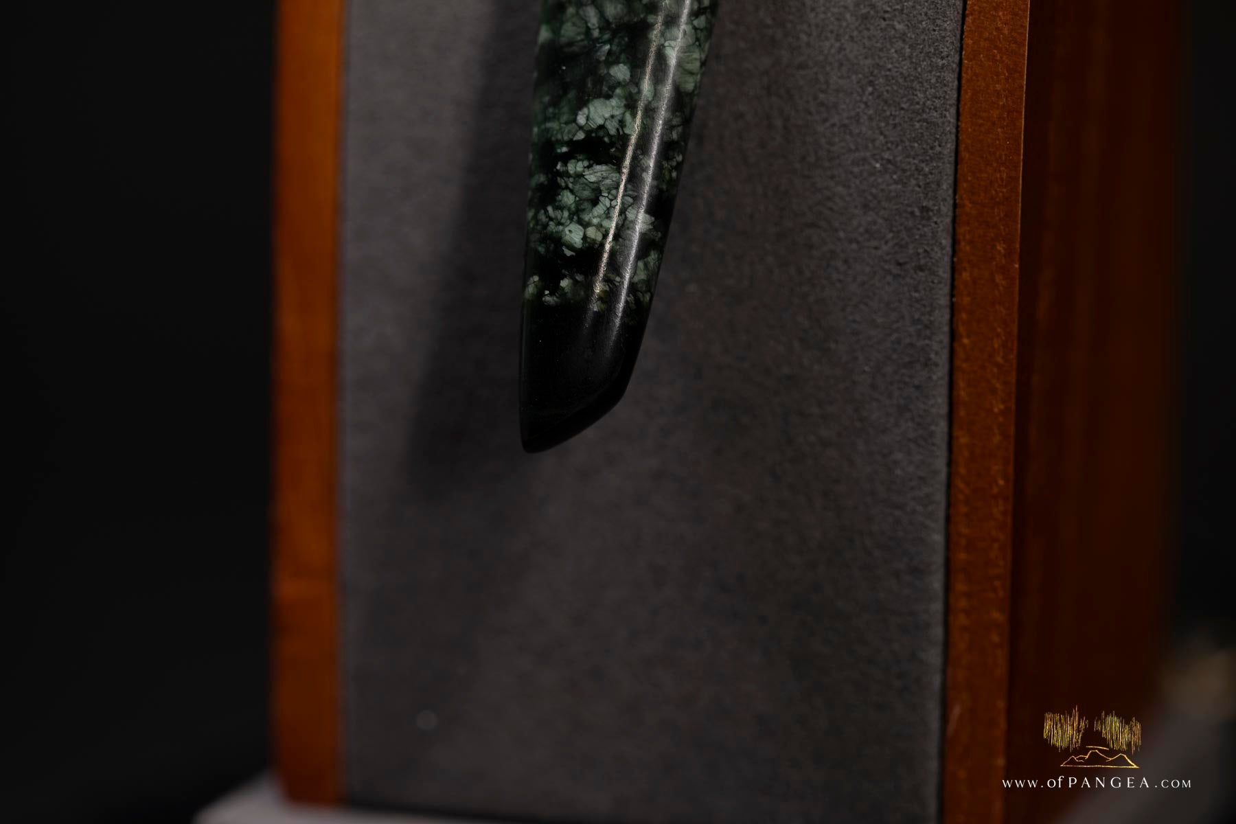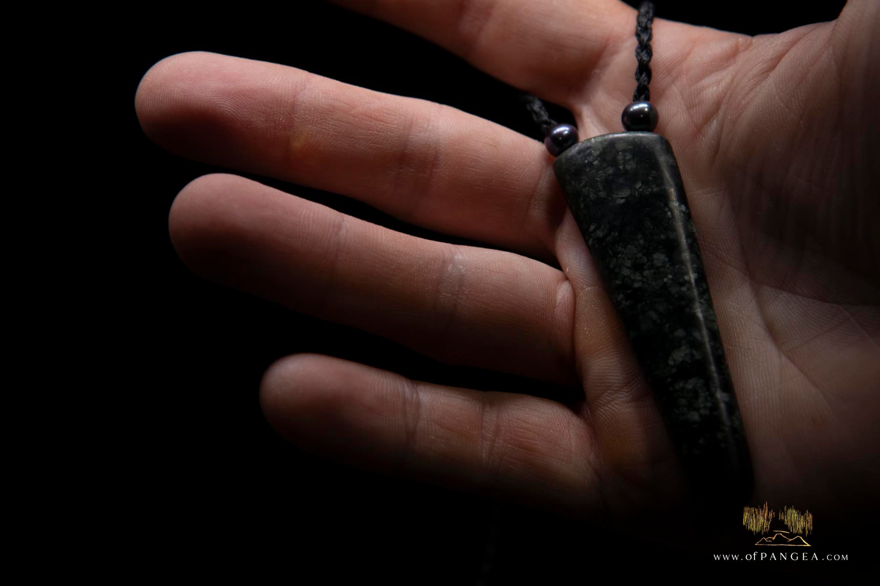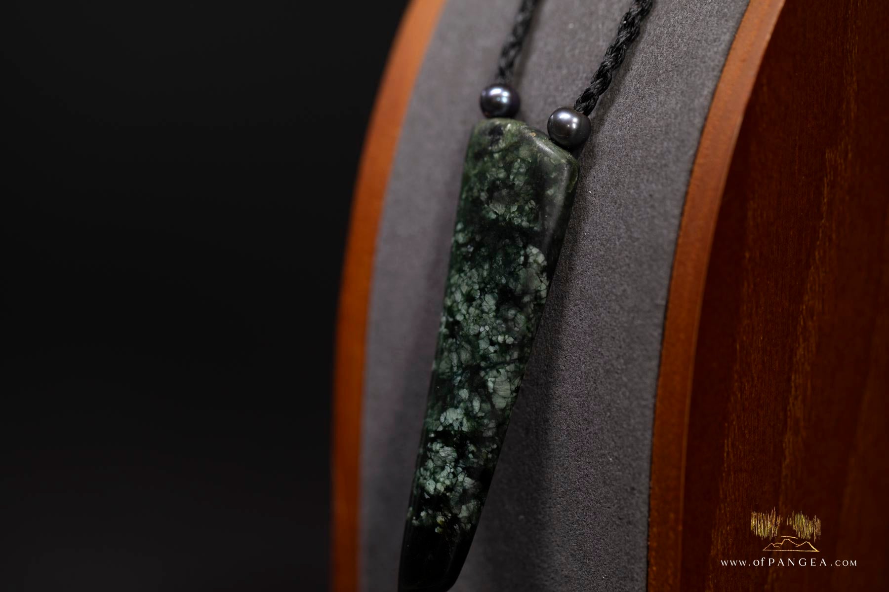 A special Bowenite Pounamu Pendant hand-carved by Joe Foster strung on a three-plaited black waxed polyester cord (also from New Zealand) with two 5mm AA FW peacock pearls. The necklace has adjustable sliding knots to change length.
