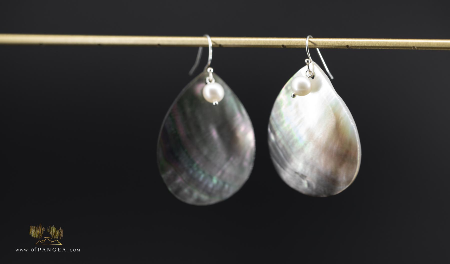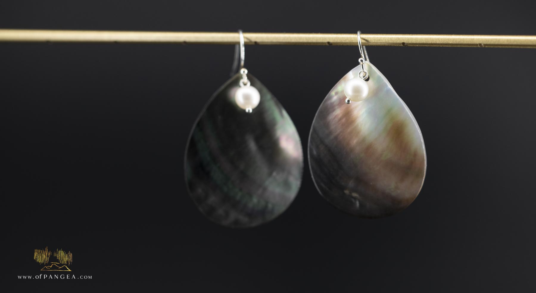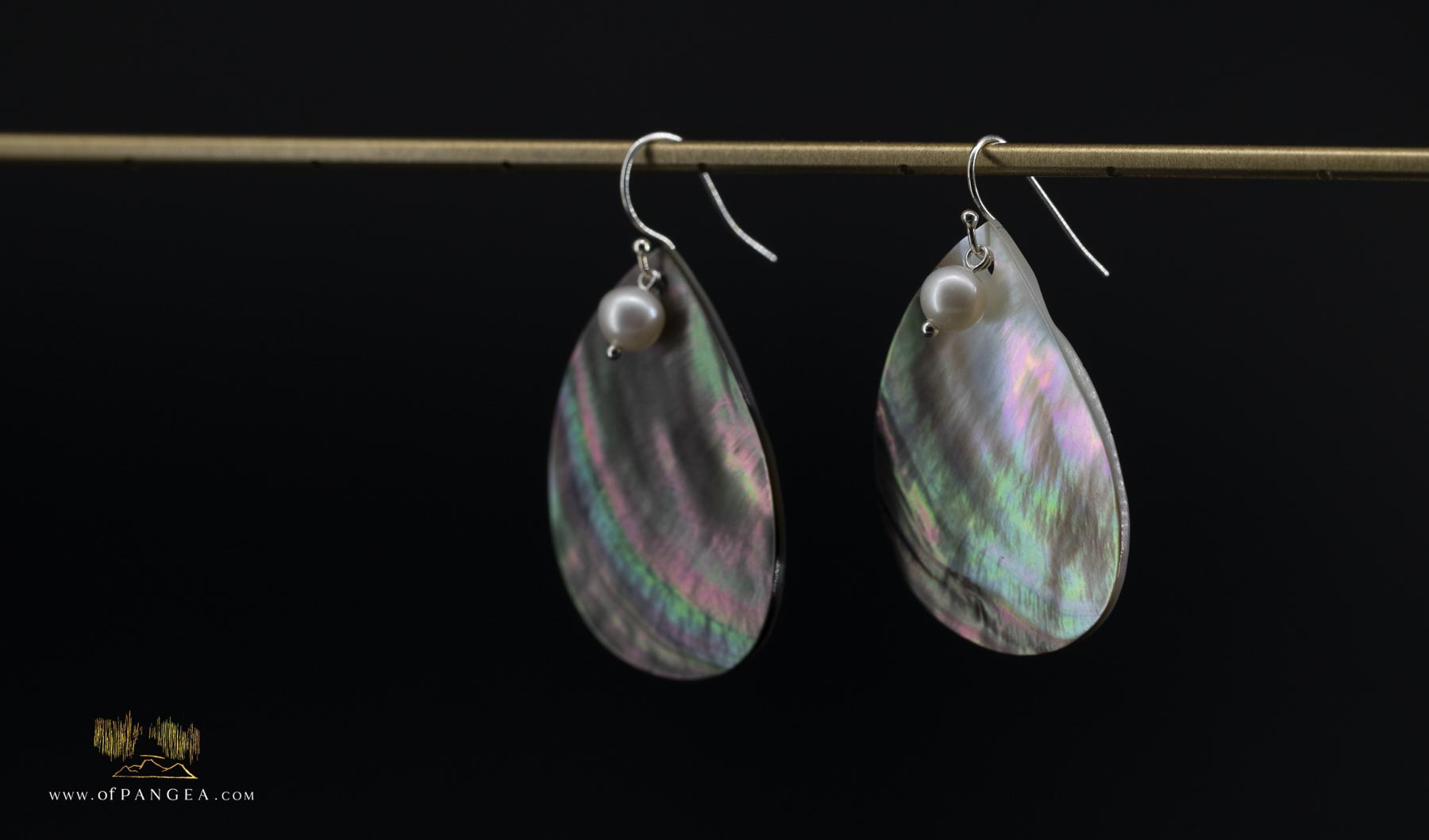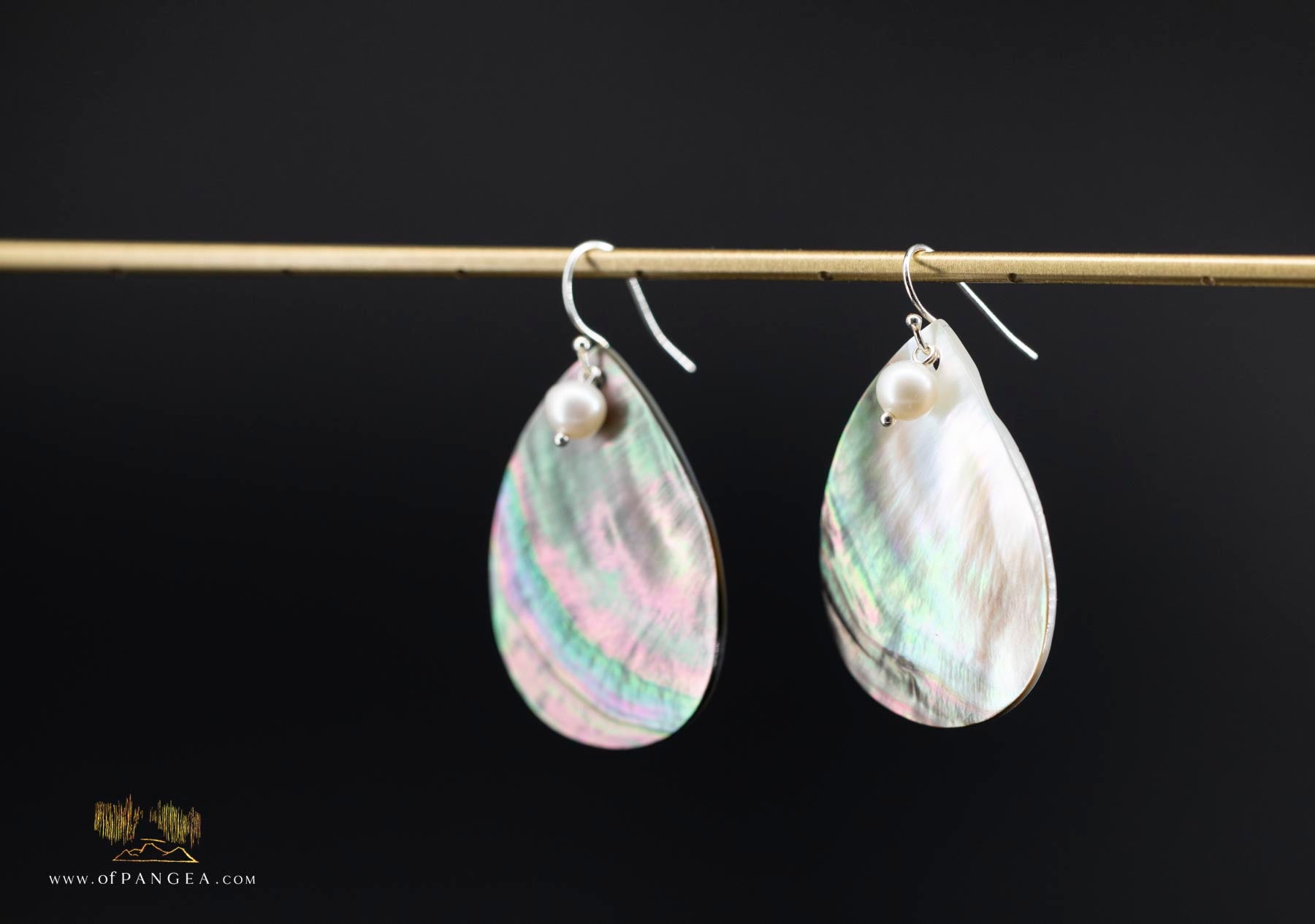 With stunning iridescence from these shells, these size-able teardrop earrings transition from black through rainbow to white depending on the angle of light which makes them incredibly stunning as earrings.