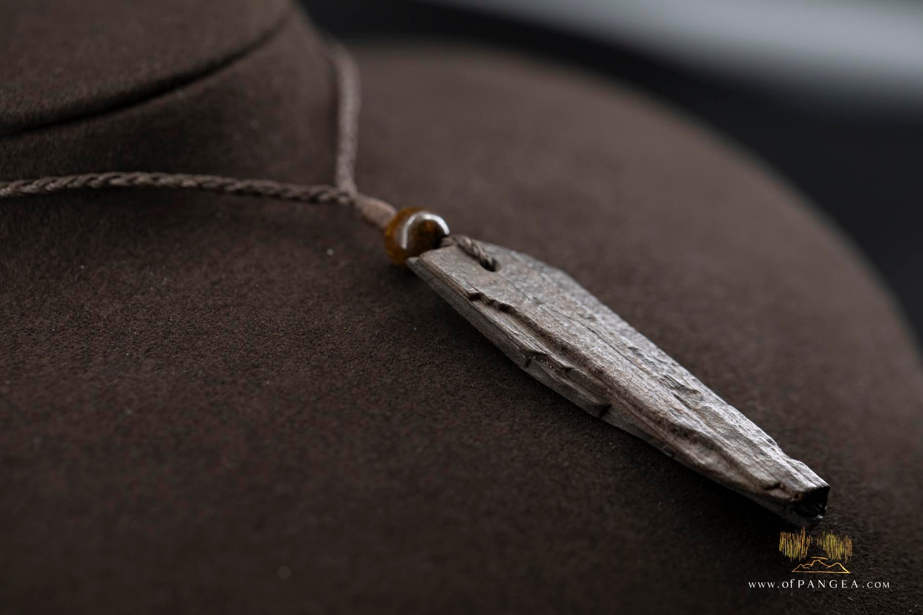 Strung on a three-plaited brown waxed cord with sliding knots for adjustable length.