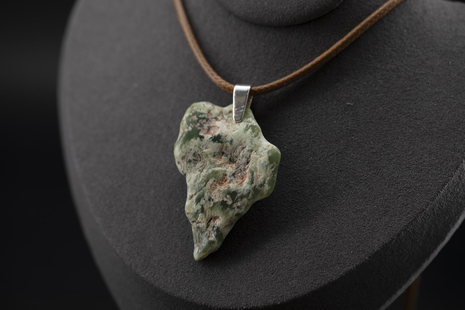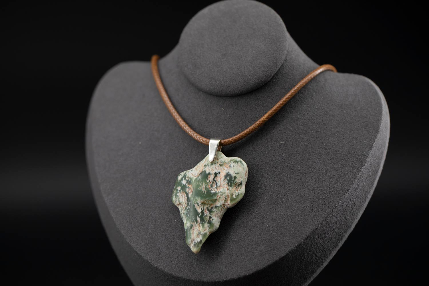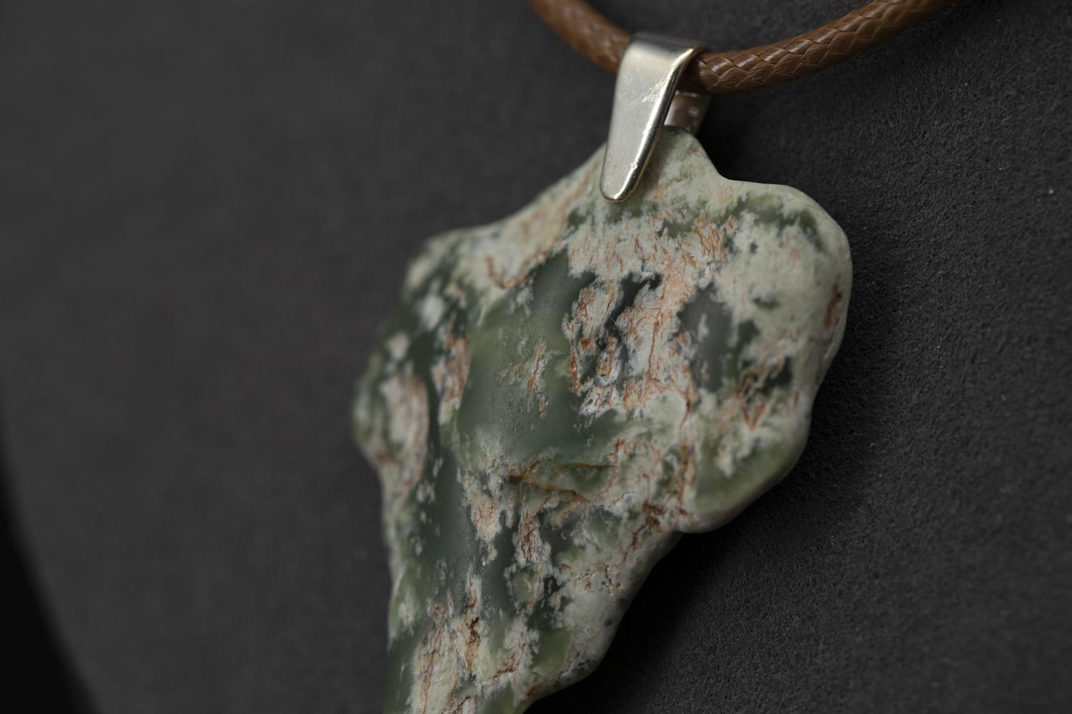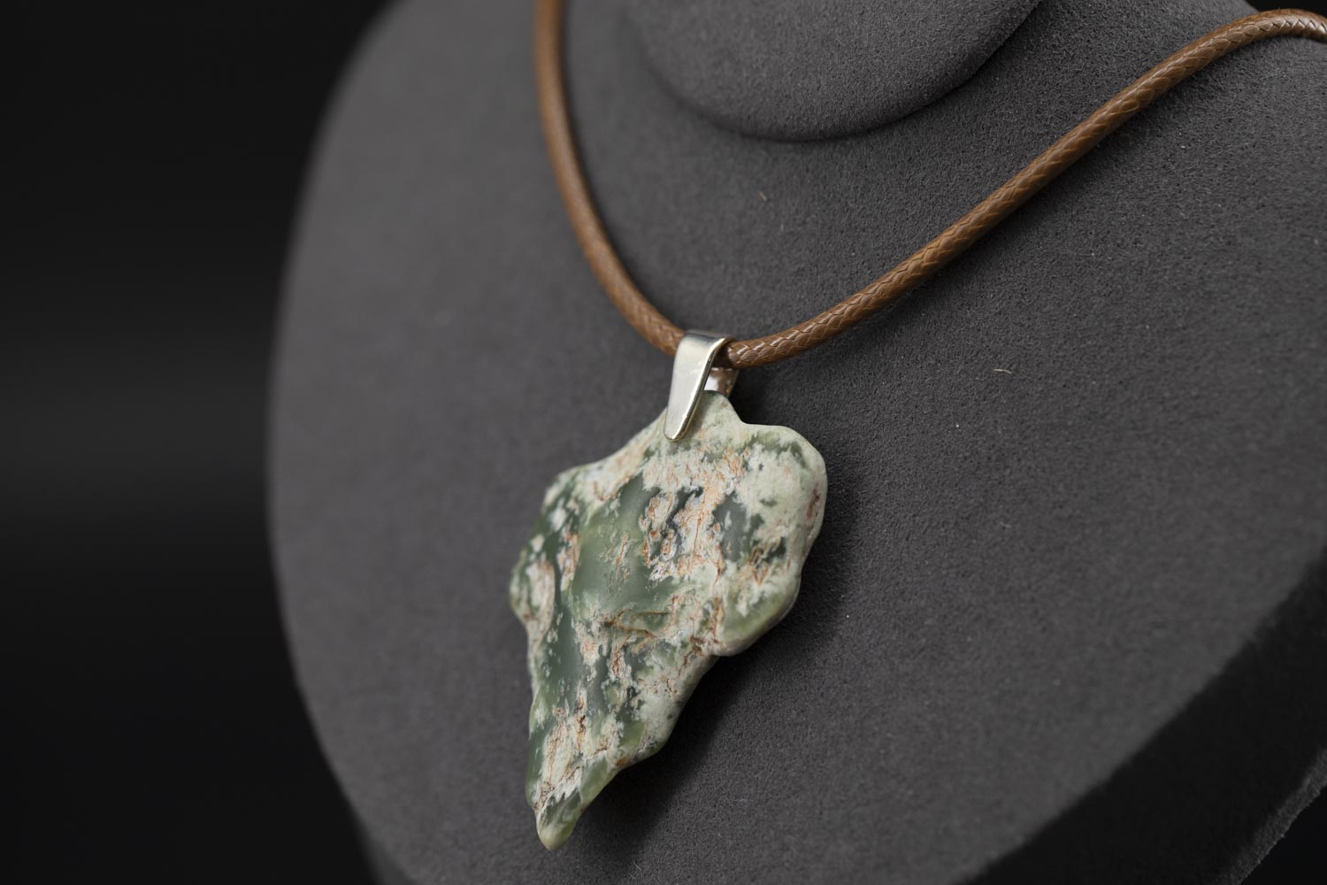 JF1048 || Wyoming Jade Slick Necklace - Green Flower Nephrite Jade - Italian leather & Sterling Silver || This Jade slick speaks for itself. Hung from sterling silver bail and an 18inch tan Italian leather and sterling silver lobster clasp necklace.